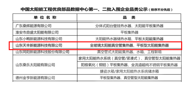 2018年10月,全國(guó)首個(gè)“中國(guó)太陽(yáng)能工程優(yōu)良部品數(shù)據(jù)中心”成立,山東天豐新能源科技有限公司太陽(yáng)能系列產(chǎn)品成功首批入圍!