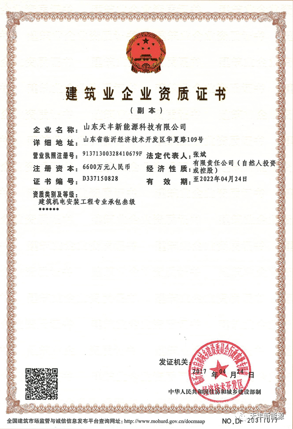 天豐新能源在全國范圍內(nèi)已先后取得山東、河南、河北、安徽、山西等十余個(gè)省市及100余個(gè)地市的認(rèn)證備案證書或推廣證書。