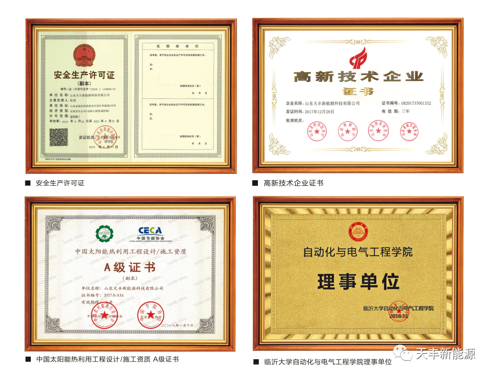 作為太陽能熱利用工程專業(yè)品牌,天豐早早攬獲“建筑機(jī)電安裝工程專業(yè)承包三級資質(zhì)”、“太陽能熱利用工程設(shè)計(jì)、施工A級資質(zhì)”等全品類產(chǎn)品資質(zhì)加身,進(jìn)一步夯實(shí)在太陽能陽臺(tái)壁掛領(lǐng)域市場的領(lǐng)軍地位。